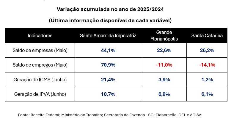 Santo Amaro da Imperatriz vive uma transformação econômica. É o que mostra a Análise Socioeconômica apresentada pelo Instituto de Desenvolvimento Econômico Local (IDEL), em parceria com a Associação Empresarial de Santo Amaro da Imperatriz (ACISAI), revelando que o município teve no acumulado do ano de 2025, um desempenho superior ao da Grande Florianópolis e de Santa Catarina nos principais indicadores, como geração de empresas, empregos, ICMS e IPVA.