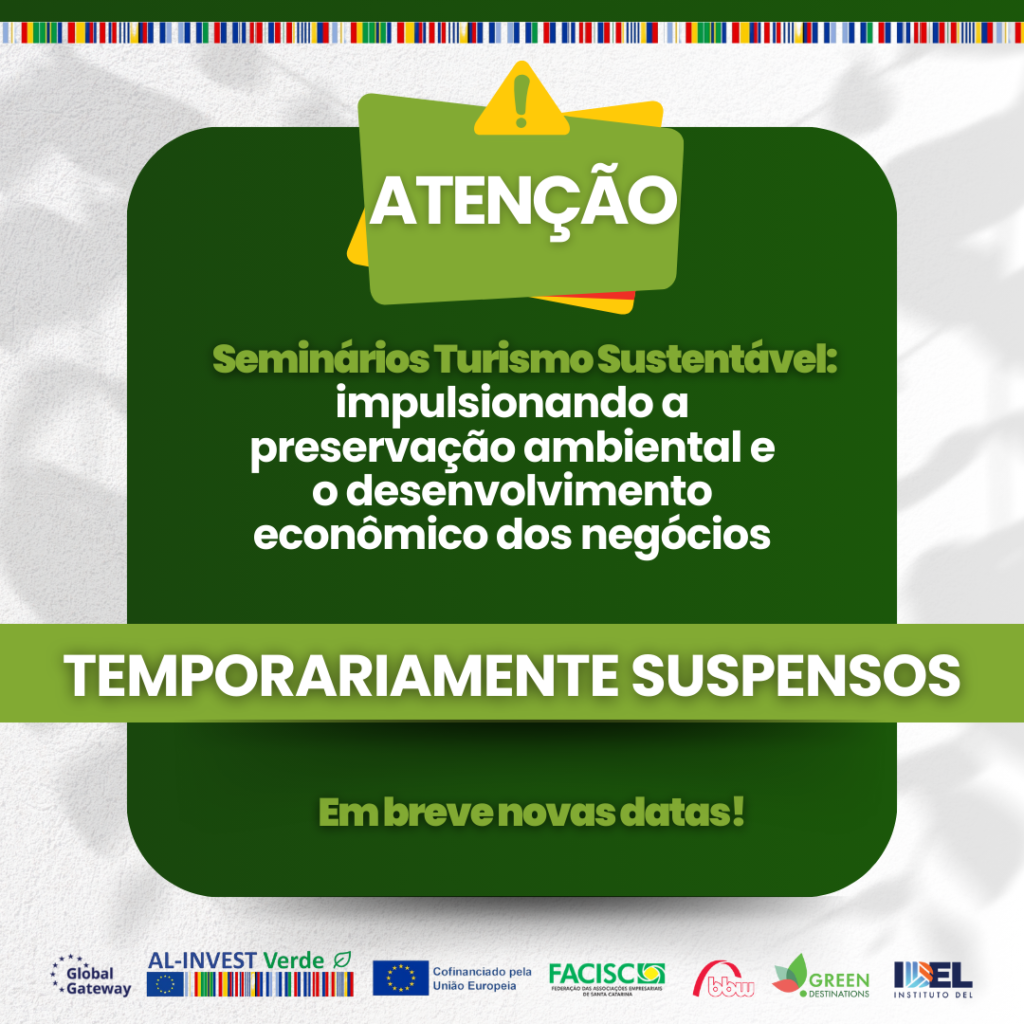 Informamos que os seminários “Turismo Sustentável: Impulsionando a Preservação Ambiental e o Desenvolvimento Econômico dos Negócios”, que seriam realizados em Lages, Criciúma e Braço do Norte neste mês, estão temporariamente suspensos.
