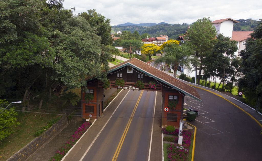 E se a ideia for também desbravar a região, antes mesmo de ir para o hotel, chegando na cidade, vale uma parada no portal da cidade, que já coloca os visitantes no clima austríaco de Treze Tílias.